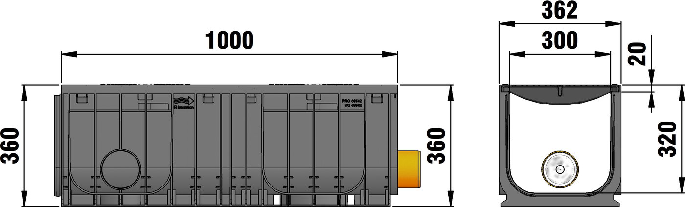DRAINFIX CLEAN RNC 300 BASIC type 010 - Starting element, filter substrate channel with the operating principle of surface filtration, made of recycled polypropylene, nominal width 300 mm, CE compliant, tested according to the requirements of the German technical authority (DIBt), with integrated edge frames made of composite, incl. DRAINFIX CLEAN-Drainage pipe DN/OD 100 wrapped with geotextile and connector, tied at the end, with ductile iron cover 2x SW 142/18 mm, made of spheroidal ductile iron EN-GJS-500-7, black, load class A 15 - E 600 according to EN 1433, with longitudinal slide protection and locking, LxWxH 1000x362x360 mm, item no . 98012