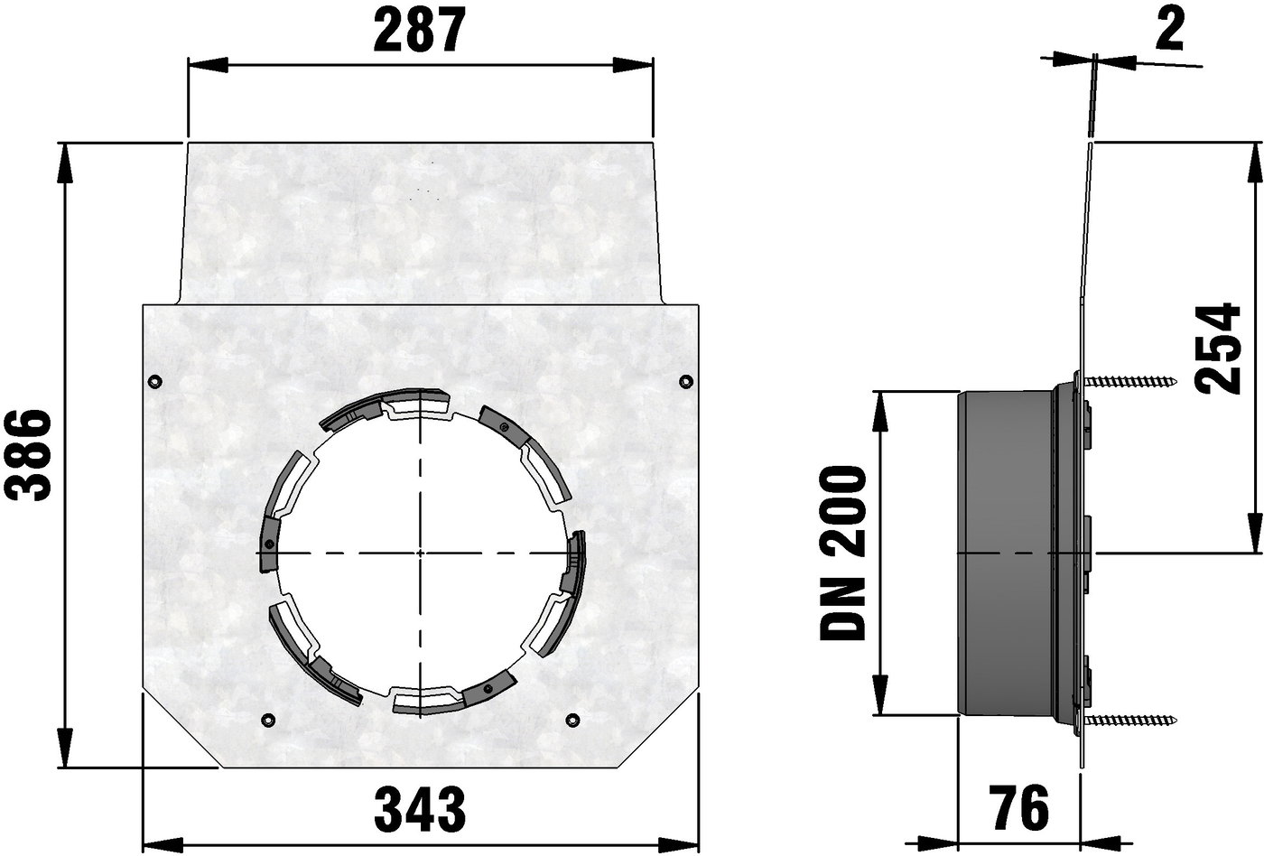 for NW 300, for type 01, for for end of channel run tongue side, incl. screws, with KG2000-PVC-U pipe outlet DN/OD 200, galvanised