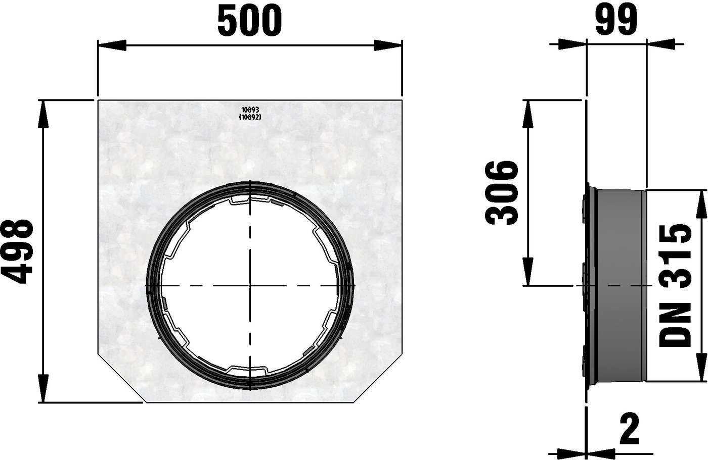 for NW 400, for type 010, with KG2000-PVC-U pipe outlet DN/OD 315, galvanised