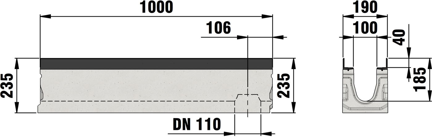 FASERFIX SUPER 100 type 010L - Channel body made of fibre-reinforced concrete, load class A 15 - F 900 according to EN 1433, with vertical connection possibility DN/OD 110 at the end of the channel in channel base, CE compliant, with edge frame made of KTL-coated ductile iron, with sealing groove, cover inlay depth 40 mm, 8-fold bolting per 0.5 m piece, LxWxH 1000x190x235 mm, item no. 26446