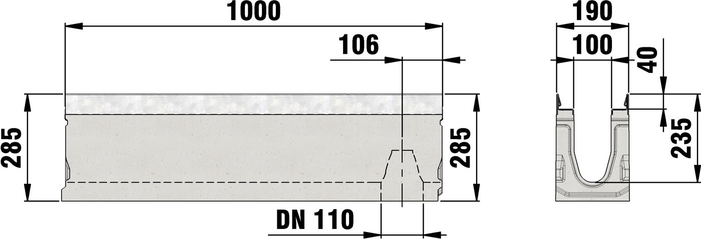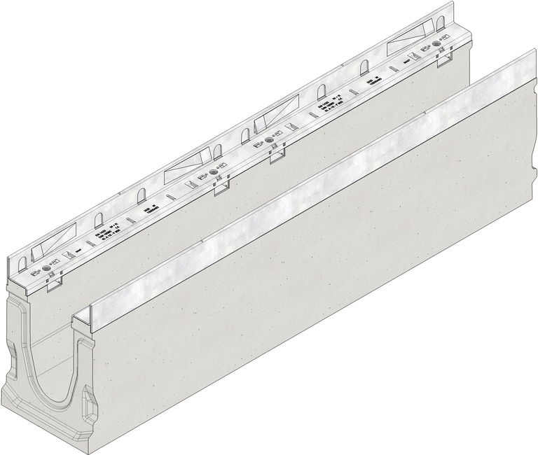 FASERFIX SUPER 100 type 020L - Channel body made of fibre-reinforced concrete, load class A 15 - F 900 according to EN 1433, with vertical connection possibility DN/OD 110 at the end of the channel in channel base, CE compliant, with edge frame made of galvanised steel and boltless quick-locking system SIDE-LOCK for quick and easy installation of the cover, 8-fold bolting additionally possible, 8-fold locking, with sealing groove, cover inlay depth 40 mm, LxWxH 1000x190x285 mm, item no. 26047