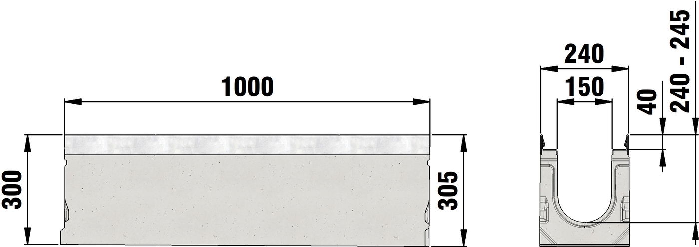 FASERFIX SUPER 150 type 1 - 19 - Channel body made of fibre-reinforced concrete, load class A 15 - F 900 according to EN 1433, CE compliant, sloping depth channel 0.5 %, with edge frame made of galvanised steel, with boltless quick-locking system SIDE-LOCK for quick and easy installation of the cover, 8-fold bolting additionally possible, 8-fold locking, with sealing groove, LxWxH 1000x240x255-350 mm, item no. 22001 - 22019