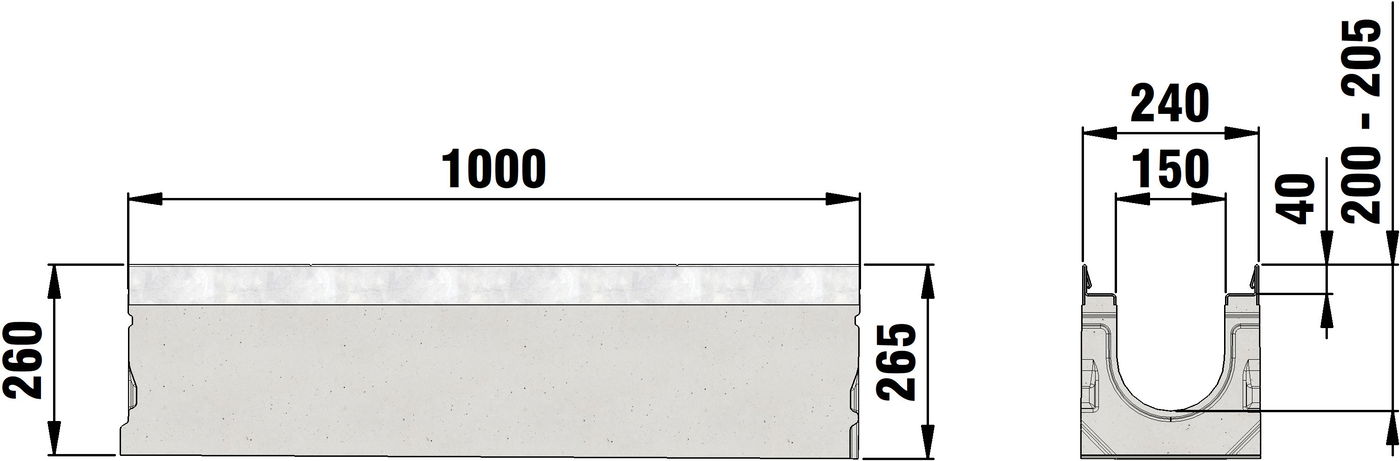 FASERFIX SUPER 150 type 1 - 19 - Channel body made of fibre-reinforced concrete, load class A 15 - F 900 according to EN 1433, CE compliant, sloping depth channel 0.5 %, with edge frame made of galvanised steel, with boltless quick-locking system SIDE-LOCK for quick and easy installation of the cover, 8-fold bolting additionally possible, 8-fold locking, with sealing groove, LxWxH 1000x240x255-350 mm, item no. 22001 - 22019
