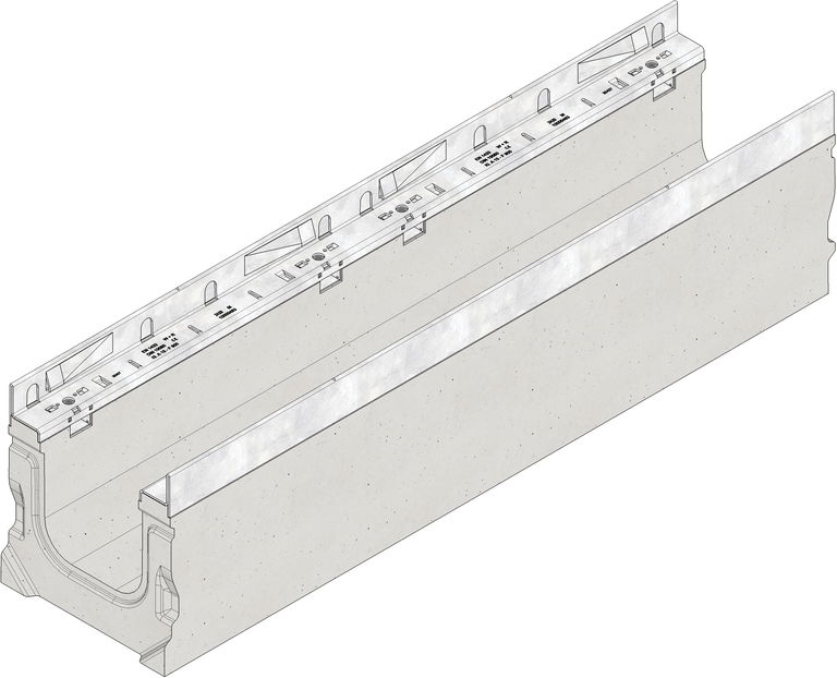 FASERFIX SUPER 150 type 01 angular - Channel body made of fibre-reinforced concrete, load class A 15 - E 600 according to EN 1433, CE compliant, with edge frame made of galvanised steel, with boltless quick-locking system SIDE-LOCK for quick and easy installation of the cover, 8-fold bolting additionally possible, 8-fold locking, with sealing groove, cover inlay depth 40 mm, LxWxH 1000x240x255 mm, item no. 22105