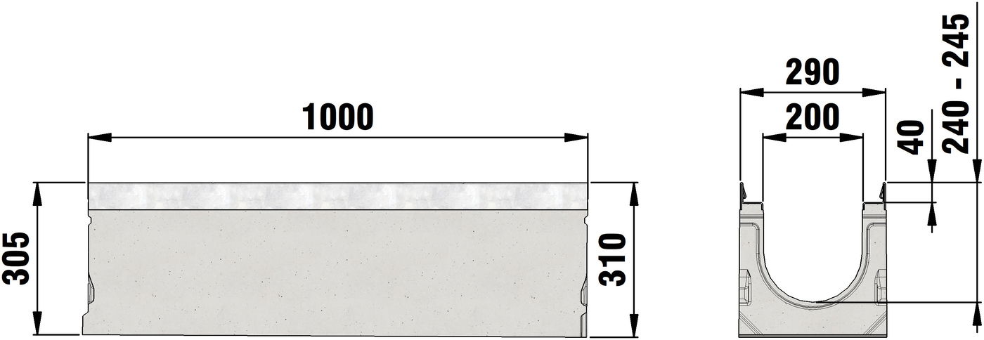 FASERFIX SUPER 200 type 1-19 - Channel body made of fibre-reinforced concrete, load class A 15 - F 900 according to EN 1433, CE compliant, sloping depth channel 0.5 %, with edge frame made of galvanised steel and with boltless quick-locking system SIDE-LOCK for quick and easy installation of the cover, 8-fold bolting additionally possible, 8-fold locking, with sealing groove, cover inlay depth 40 mm, LxWxH 1000x290x305-400 mm, item no. 23001 - 23019