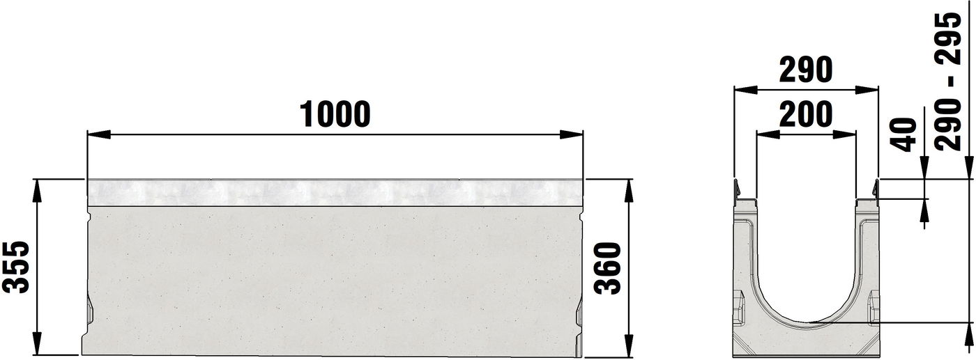 FASERFIX SUPER 200 type 1-19 - Channel body made of fibre-reinforced concrete, load class A 15 - F 900 according to EN 1433, CE compliant, sloping depth channel 0.5 %, with edge frame made of galvanised steel and with boltless quick-locking system SIDE-LOCK for quick and easy installation of the cover, 8-fold bolting additionally possible, 8-fold locking, with sealing groove, cover inlay depth 40 mm, LxWxH 1000x290x305-400 mm, item no. 23001 - 23019