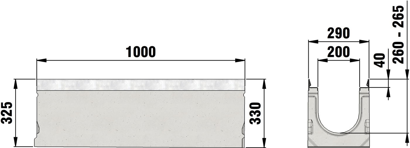 FASERFIX SUPER 200 type 1-19 - Channel body made of fibre-reinforced concrete, load class A 15 - F 900 according to EN 1433, CE compliant, sloping depth channel 0.5 %, with edge frame made of galvanised steel and with boltless quick-locking system SIDE-LOCK for quick and easy installation of the cover, 8-fold bolting additionally possible, 8-fold locking, with sealing groove, cover inlay depth 40 mm, LxWxH 1000x290x305-400 mm, item no. 23001 - 23019