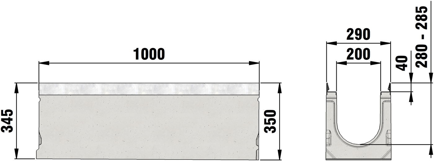 FASERFIX SUPER 200 type 1-19 - Channel body made of fibre-reinforced concrete, load class A 15 - F 900 according to EN 1433, CE compliant, sloping depth channel 0.5 %, with edge frame made of galvanised steel and with boltless quick-locking system SIDE-LOCK for quick and easy installation of the cover, 8-fold bolting additionally possible, 8-fold locking, with sealing groove, cover inlay depth 40 mm, LxWxH 1000x290x305-400 mm, item no. 23001 - 23019
