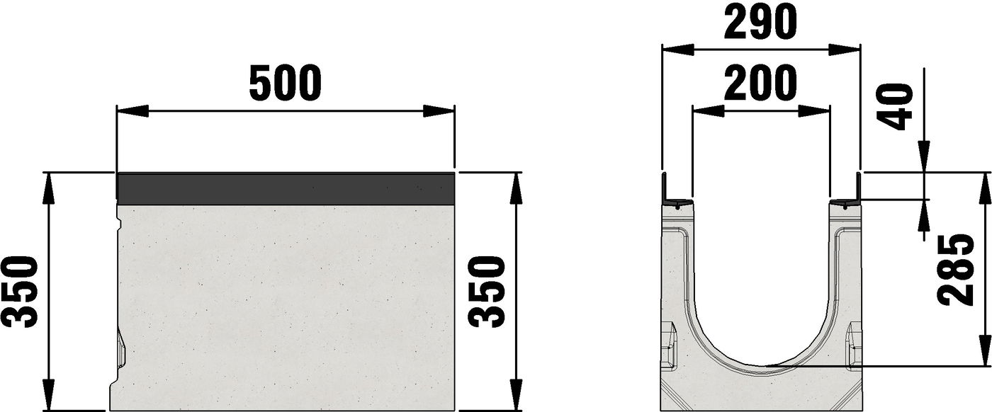 FASERFIX SUPER 200 type 010 - Channel body made of fibre-reinforced concrete, load class A 15 - F 900 according to EN 1433, CE compliant, with edge frame made of KTL-coated ductile iron, with sealing groove, cover inlay depth 40 mm, 4-fold-bolting per 0.5 m piece, LxWxH 500x290x350 mm, item no. 23450