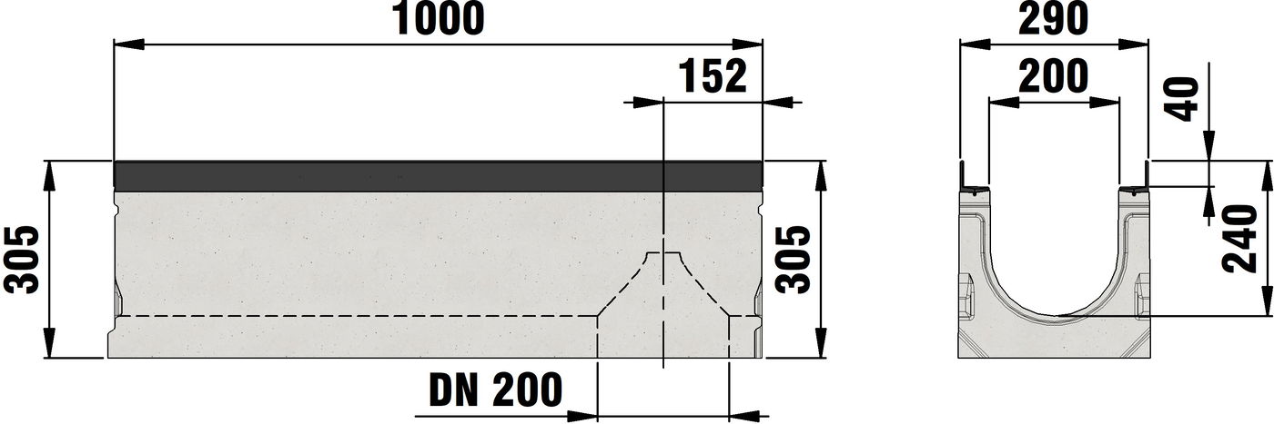 FASERFIX SUPER 200 Channel body type 01L with outlet DN/OD 200, with edge frames made of KTL-coated ductile iron, 1 m
