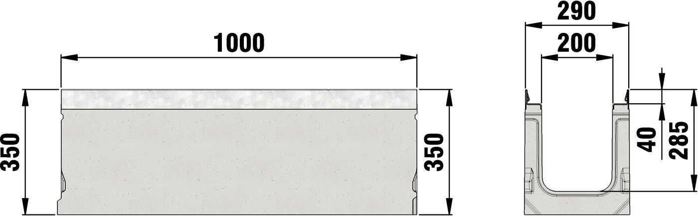 FASERFIX SUPER 200 angular type 010 - Channel body made of fibre-reinforced concrete, load class A 15 - E 600 according to EN 1433, CE compliant, with edge frame made of galvanised steel, with boltless quick-locking system SIDE-LOCK for quick and easy installation of the cover, 8-fold bolting additionally possible, 8-fold locking, with sealing groove, cover inlay depth 40 mm, LxWxH 1000x290x350 mm, item no. 23106