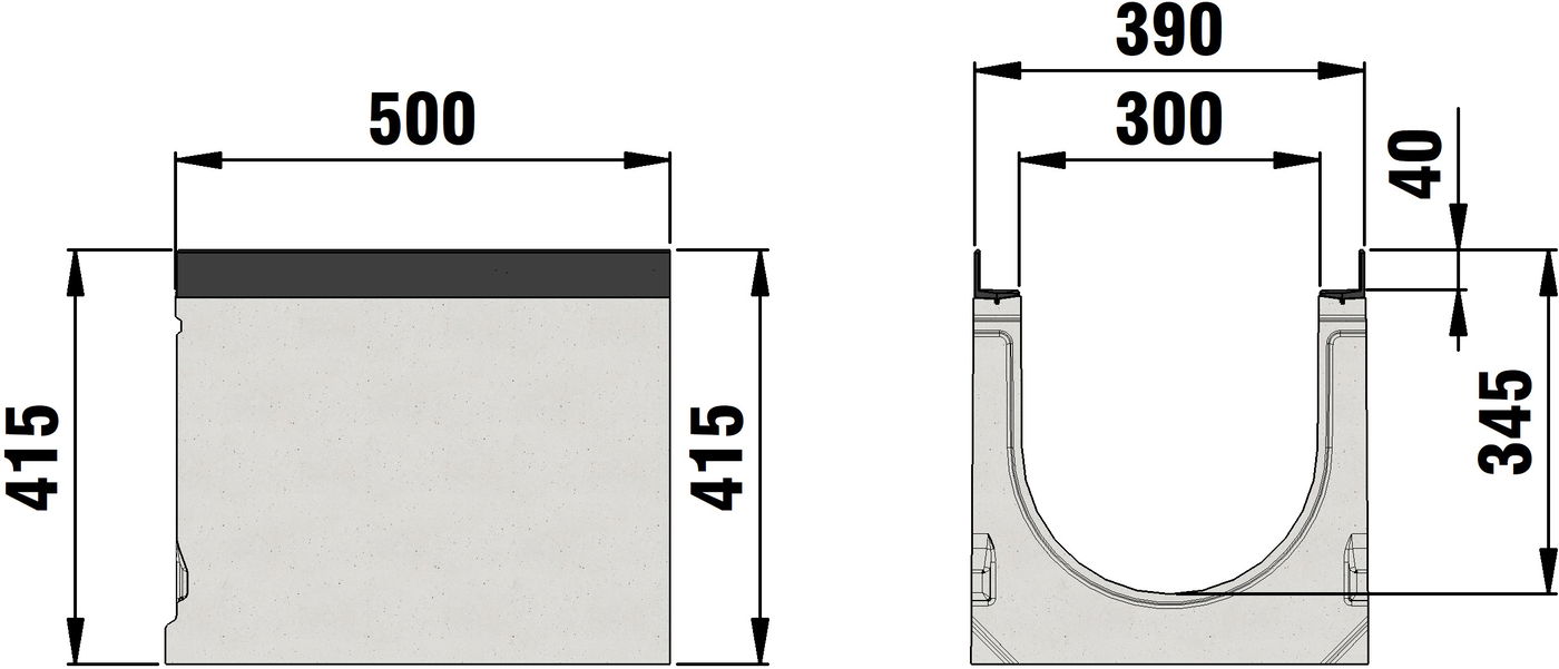 FASERFIX SUPER 300 type 01 - Channel body made of fibre-reinforced concrete, load class A 15 - F 900 according to EN 1433, CE compliant, with edge frame made of KTL-coated ductile iron, with sealing groove, cover inlay depth 40 mm, 4-fold bolting per 0.5 m piece, LxWxH 500x390x415 mm, item no. 24449