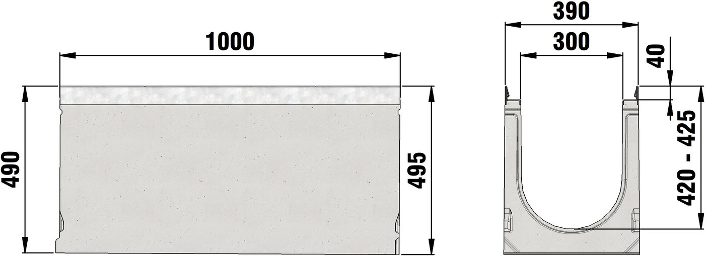FASERFIX SUPER 300 type 1 - 19 - Channel body made of fibre-reinforced concrete, load class A 15 - F 900 according to EN 1433, CE compliant, sloping depth channel 0.5 %, with edge frame made of galvanised steel and boltless quick-locking system SIDE-LOCK for quick and easy installation of the cover, 8-fold bolting additionally possible, 8-fold locking, with sealing groove, cover inlay depth 40 mm, LxWxH 1000x390x415-510 mm, item no. 24201 - 24219