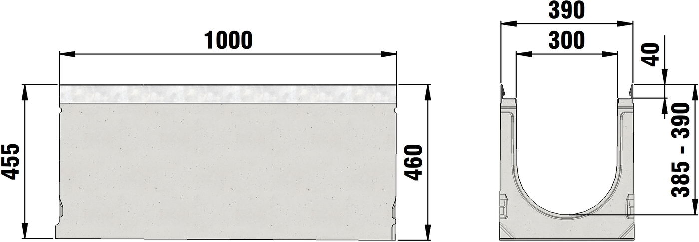 FASERFIX SUPER 300 type 1 - 19 - Channel body made of fibre-reinforced concrete, load class A 15 - F 900 according to EN 1433, CE compliant, sloping depth channel 0.5 %, with edge frame made of galvanised steel and boltless quick-locking system SIDE-LOCK for quick and easy installation of the cover, 8-fold bolting additionally possible, 8-fold locking, with sealing groove, cover inlay depth 40 mm, LxWxH 1000x390x415-510 mm, item no. 24201 - 24219