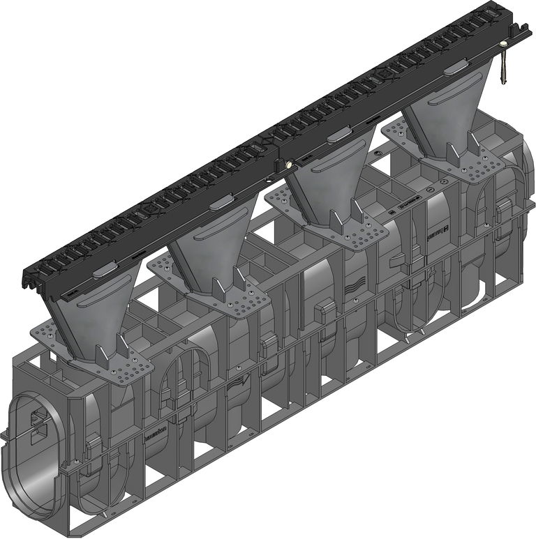 RECYFIX HICAP F 1200 consists of a closed channel body, made of recycled polypropylene, with inlet funnel, with integrated ductile iron traverse bar cover SW 13/28 mm, KTL-coated, load class A 15 - F 900 according to EN 1433, length 1000 mm, item no. 13025
