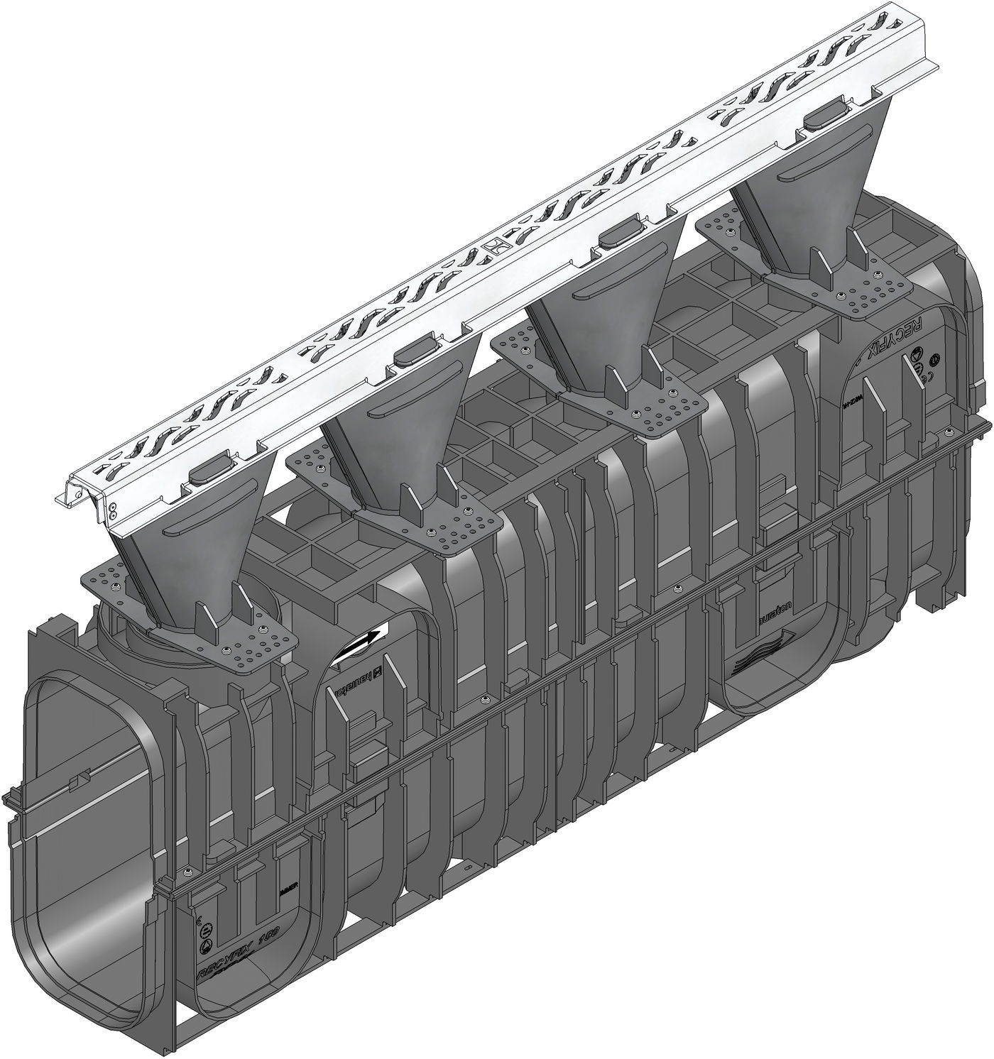 RECYFIX HICAP F 3200 consists of a closed channel body, made of recycled polypropylene, with inlet funnel, with integrated design cover WAVE 6 mm, made of stainless steel CNS 1.4301, load class A 15 - D 400 according to EN 1433, length 1000 mm, item no. 13222