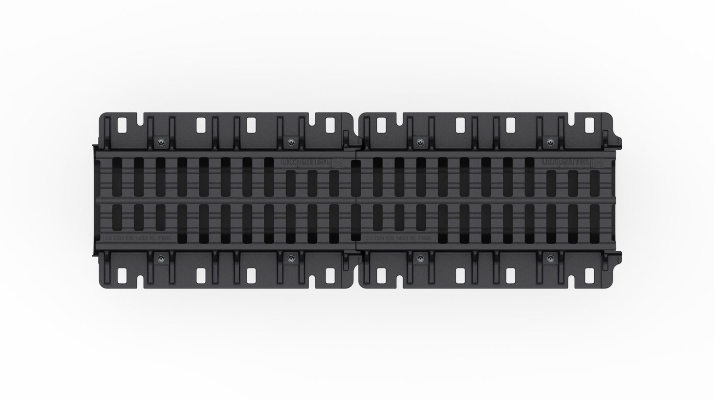 RECYFIX MONOTEC ULTRA 200 type 010 - Monolithic channel, consists of channel body made of recycled polypropylene and permanently integrated ductile iron cover, made of spheroidal ductile iron EN-GJS-500-7, 2x SW 75/18 mm, black, according to EN 1433, with lateral (DN/OD 110) and vertical (DN/OD 110/160) connection possibility, load class A 15 - F 900 according to EN 1433, LxWxH 1000x340x281 mm, item no. 10465