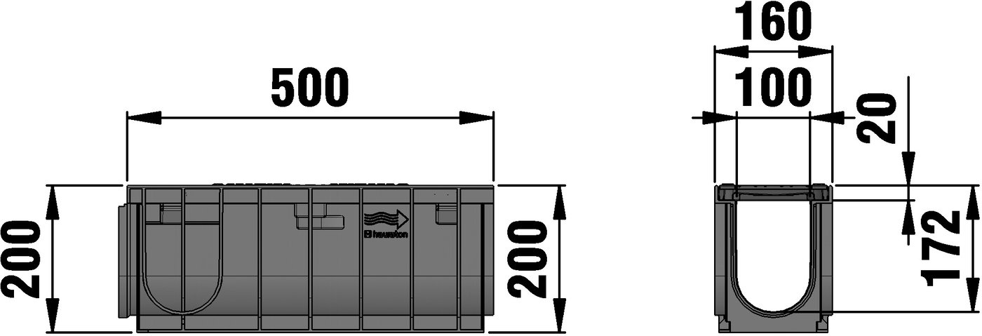 RECYFIX NC 100 type 010 - Channel body made of recycled polypropylene, with integrated edge frames, with ductile iron cover SW 104 /10 mm, made of spheroidal ductile iron EN-GJS-500-7, black, with longitudinal slide protection, 4-fold bolting, load class A 15 - D 400 according to EN 1433, LxWxH 500x160x200 mm, item no. 48745