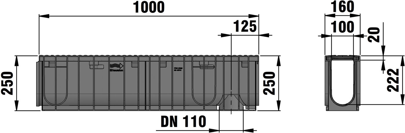 RECYFIX NC 100 type 020 - Channel body made of recycled polypropylene, with integrated edge frame, with vertical connection possibility DN/OD 110, with ductile iron cover SW 110/9 mm in FIBRETEC design, made of spheroidal ductile iron EN-GJS-500-7, black , with longitudinal slide protection, with 8-fold bolting, load class A 15 - D 400 according to DIN 19580/EN 1433, LxWxH 1000x160x250 mm, item no. 40095