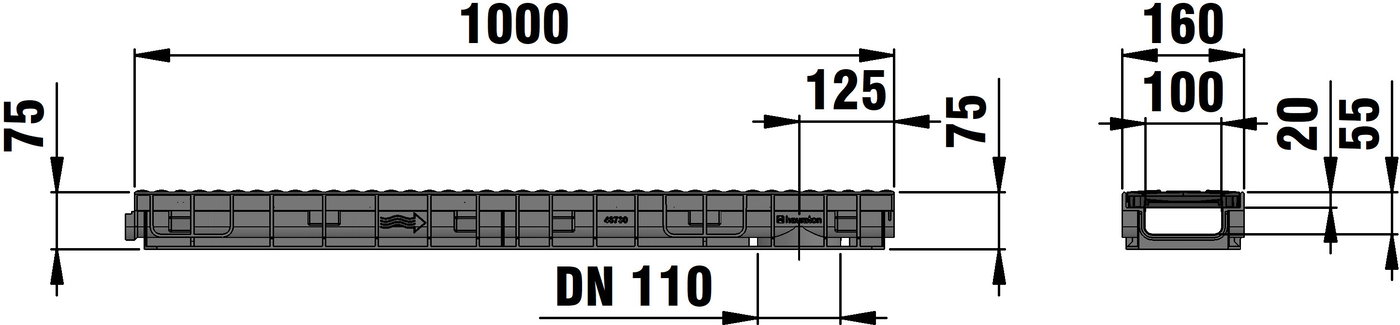 RECYFIX NC 100 type 75 - Channel body made of recycled polypropylene, with integrated edge frame, with vertical connection possibility DN/OD 110, with ductile iron cover SW 110/9 mm in FIBRETEC design, made of spheroidal ductile iron EN-GJS-500-7, KTL-coated, with longitudinal slide protection, with 8-fold bolting, load class A 15 - D 400 according to DIN 19580/EN 1433, LxWxH 1000x160x75 mm, item no. 40099