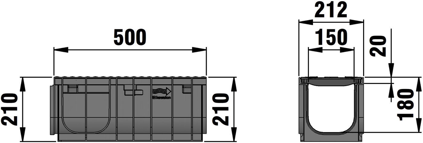 RECYFIX NC 150 type 01 - Channel body made of recycled polypropylene, with integrated edge frame, with ductile iron cover SW 148/9 mm in FIBRETEC design, made of spheroidal ductile iron EN-GJS-500-7, black, with longitudinal slide protection, with 4-fold bolting , load class A 15 - D 400 according to EN 1433, LxWxH 500x212x210 mm, item no. 40103
