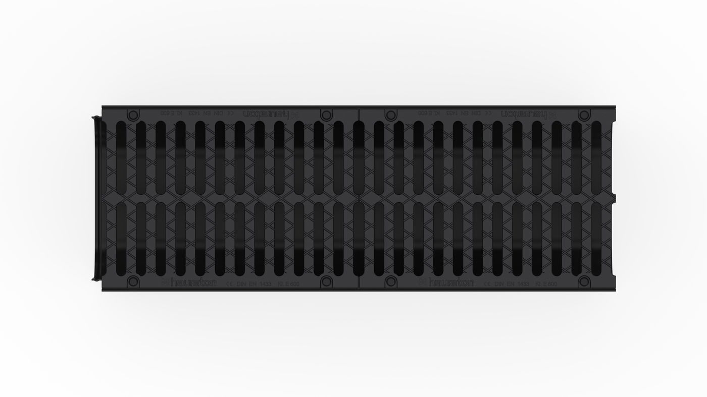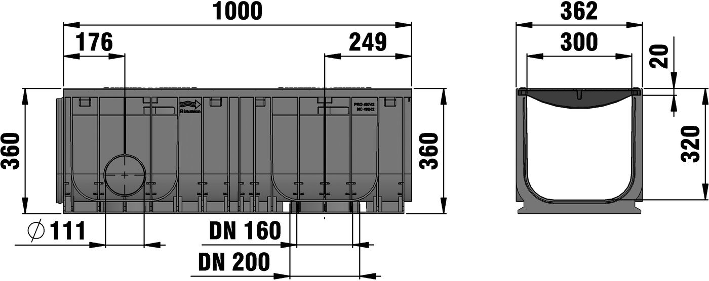 RECYFIX NC 300 type 010 - Channel body made of recycled polypropylene, with integrated edge frames, with vertical connection possibility DN/OD 160/200, with ductile iron cover 2x SW 142/18 mm, made of spheroidal ductile iron EN-GJS-500-7, KTL-coated, with longitudinal slide protection, with 8-fold bolting, load class A 15 - E 600 according to EN 1433, LxWxH 1000x362x360 mm, item no. 49882
