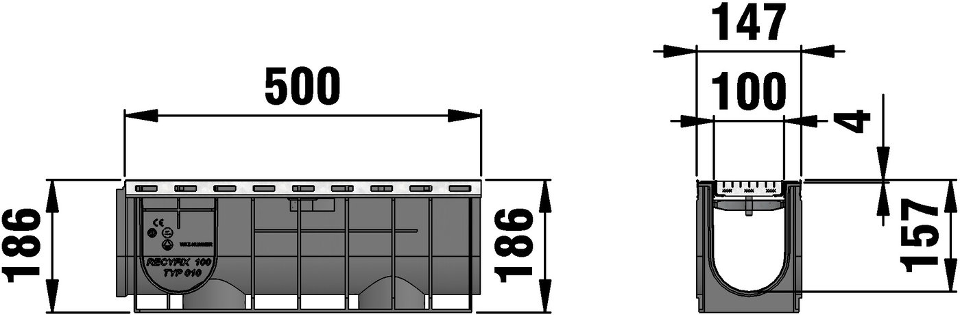 RECYFIX PLUS 100 type 010 - Channel body made of recycled polypropylene, with edge frames made of galvanised steel, with mesh cover MS 30/10 mm, made of galvanised steel, with locking, load class A 15 - B 125 according to EN 1433, LxWxH 500x147x186 mm, item no. 41428