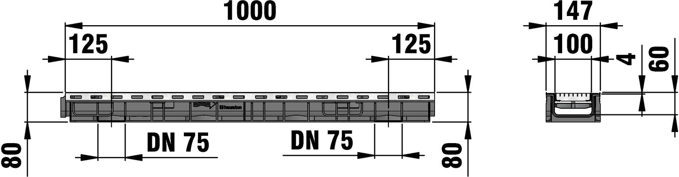 RECYFIX PLUS 100 type 80 - Channel body made of recycled polypropylene, with edge frames made of galvanised steel, with vertical connection possibility DN/OD 75, with mesh cover MS 30/10 mm, made of galvanised steel, with locking, load class A 15 - B 125 according to EN 1433, LxWxH 1000x147x80 mm, item no. 41426