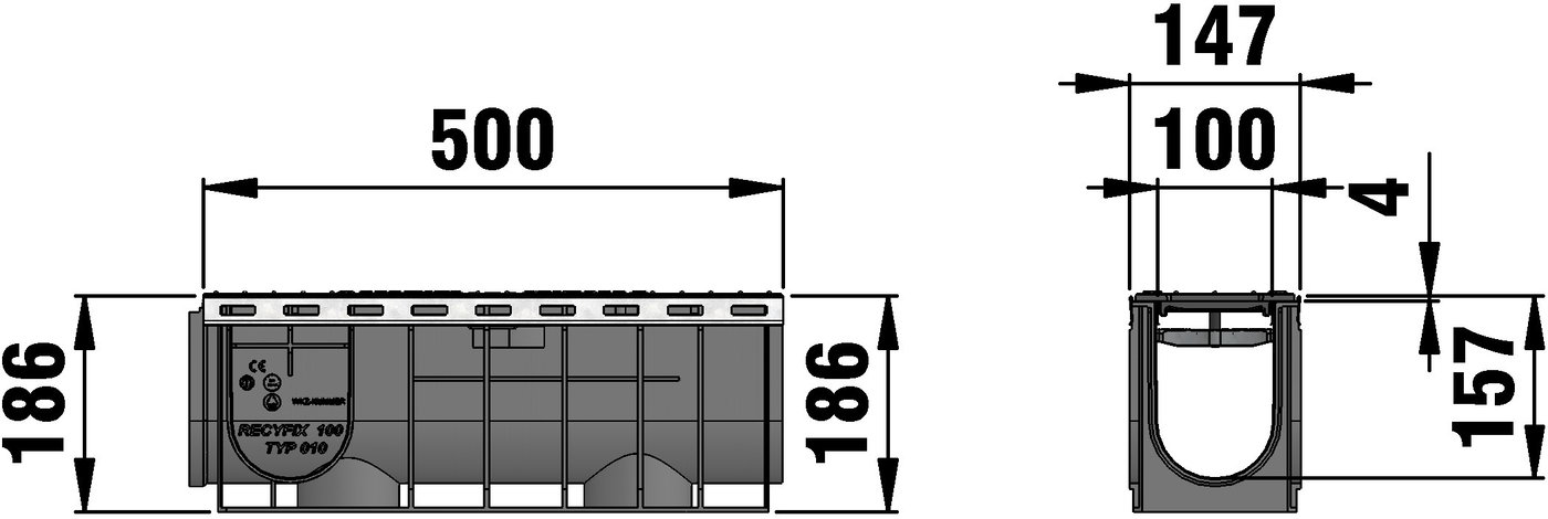 RECYFIX PLUS 100 type 010 - Channel body made of recycled polypropylene, with edge frames made of galvanised steel, with ductile iron cover SW 80/14 mm, made of spheroidal ductile iron EN-GJS-500-7, black, with longitudinal slide protection and locking, load class A 15 - C 250 according to EN 1433, LxWxH 500x147x186 mm, item no. 40386