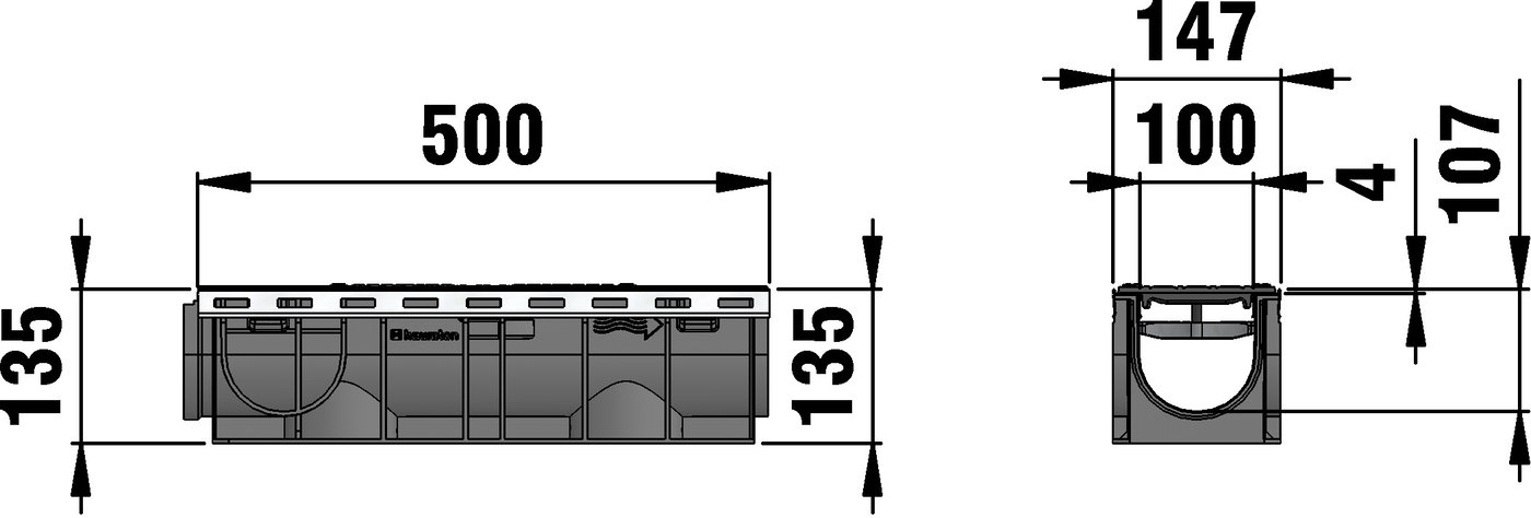 RECYFIX PLUS 100 type 01 - Channel body made of recycled polypropylene, with edge frames made of stainless steel CNS 1.4301, with GUGI-ductile iron mesh cover MS 15/25 mm, made of spheroidal ductile iron EN-GJS-500-7, black, with longitudinal slide protection and locking, load class A 15 - C 250 according to EN 1433, LxWxH 500x147x135 mm, item no. 41465