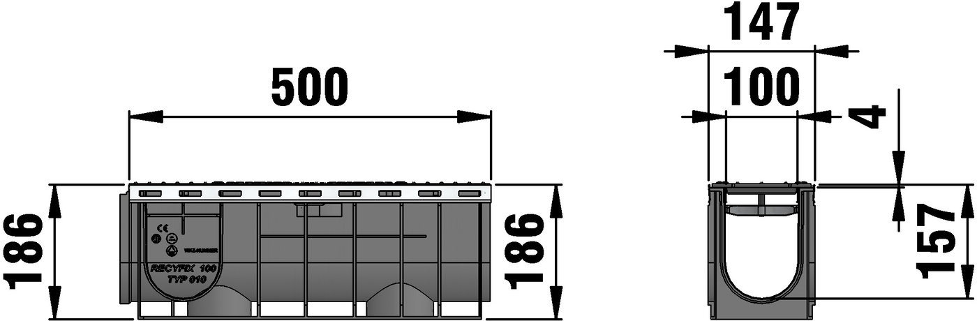 RECYFIX PLUS 100 type 010 - Channel body made of recycled polypropylene, with edge frames made of stainless steel CNS 1.4301, with ductile iron cover SW 80/6 mm, made of spheroidal ductile iron EN-GJS-500-7, black, with longitudinal slide protection and locking , load class A 15 - C 250 according to EN 1433, LxWxH 500x147x186 mm, item no. 41488