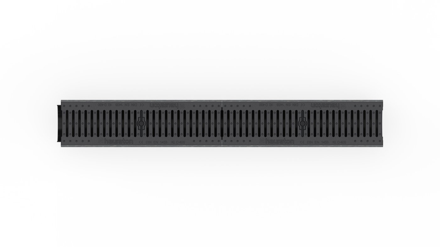 RECYFIX PLUS 100 type 01 - Channel body made of recycled polypropylene, with edge frames made of galvanised steel, with vertical connection possibility DN/OD 110, with ductile iron cover SW 80/6 mm, made of spheroidal ductile iron EN-GJS-500-7, black, with longitudinal slide protection and locking, load class A 15 - D 400 according to EN 1433, LxWxH 1000x147x135 mm, item no. 40371
