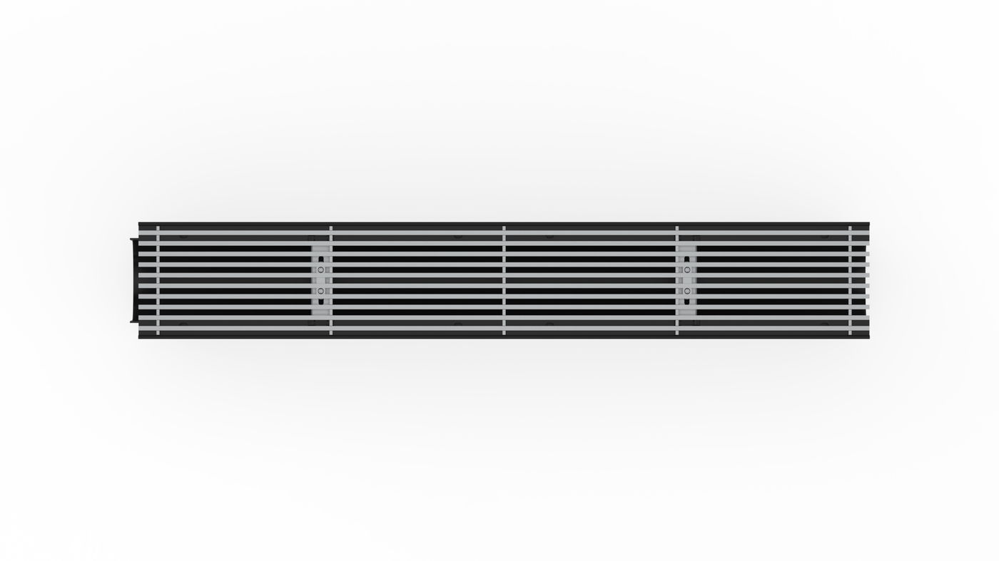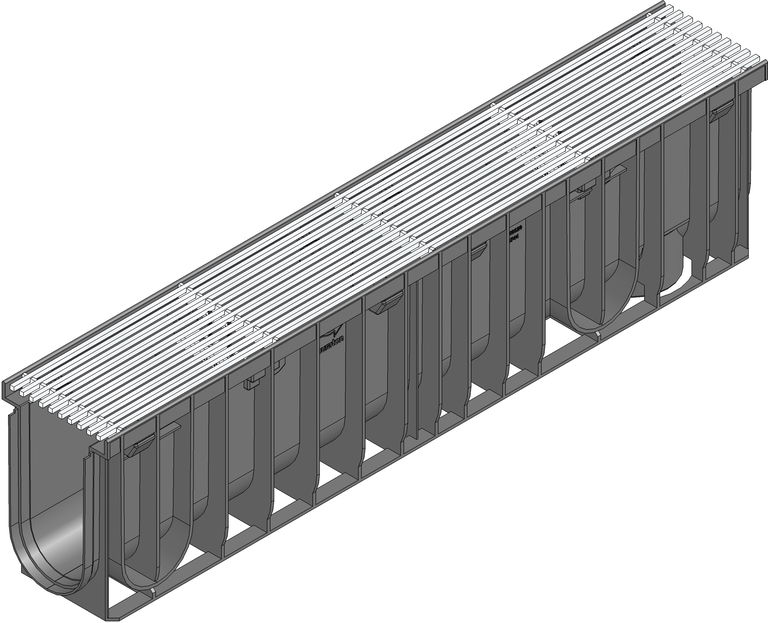 RECYFIX PRO 100 type 020 - Channel body made of recycled polypropylene, with integrated edge frames, with vertical connection possibility DN/OD 110, with longitudinal cover Filigree bar distance 8 mm, stainless steel CNS 1.4301, with locking, load class A 15 according to EN 1433, LxWxH 1000x160x250 mm, item no. 47168