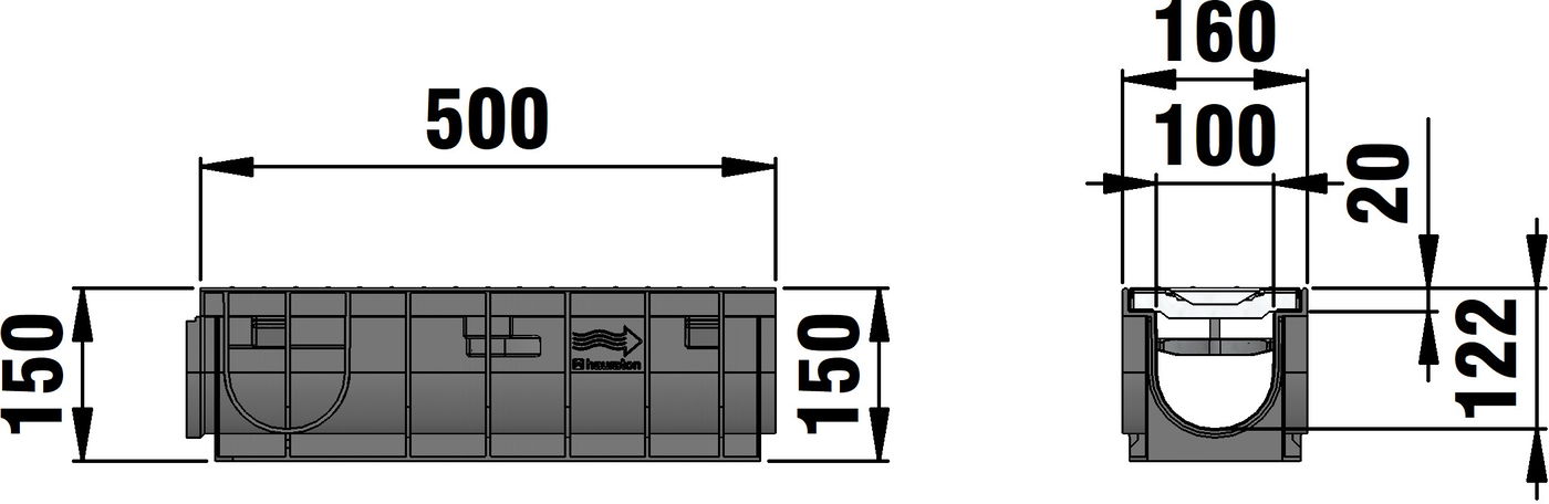 RECYFIX PRO 100 type 01 - Channel body made of recycled polypropylene, with integrated edge frames, with reinforced slotted cover SW 80/10 mm, stainless steel CNS 1.4301, with locking, load class A 15 - C 250 according to EN 1433, LxWxH 500x160x150 mm, item no. 47085