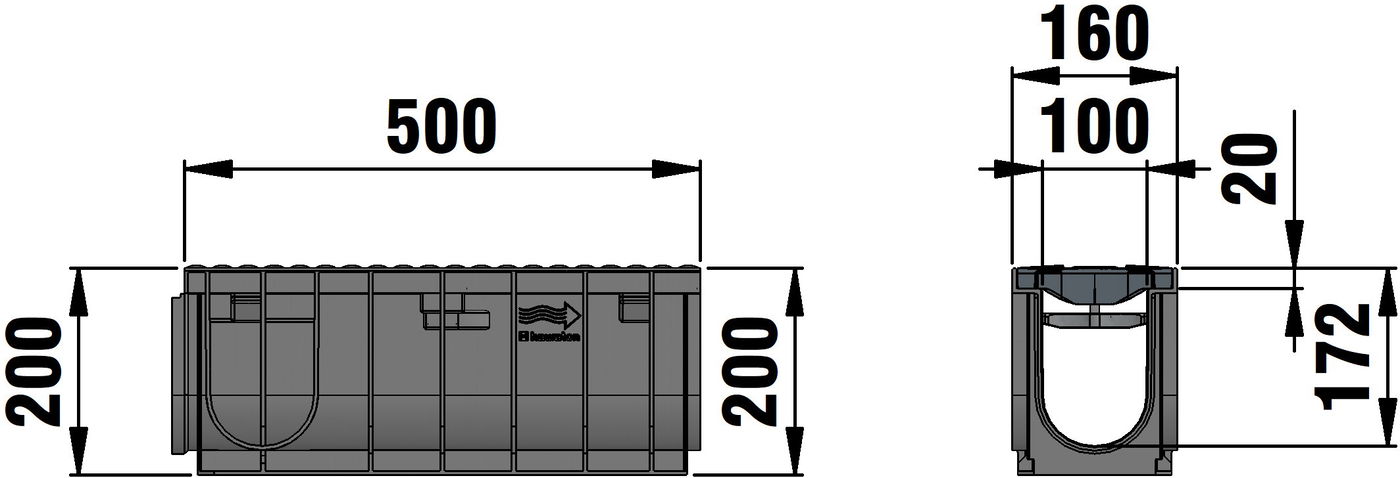 RECYFIX PRO 100 type 010 - Channel body made of recycled polypropylene, with integrated edge frames, with FIBRETEC design slotted cover SW 110/9 mm, made of fibre-reinforced polyamide, in the colour Slate, with longitudinal slide protection and locking, load class A 15 - C 250 according to EN 1433, LxWxH 500x160x200 mm, item no. 47465