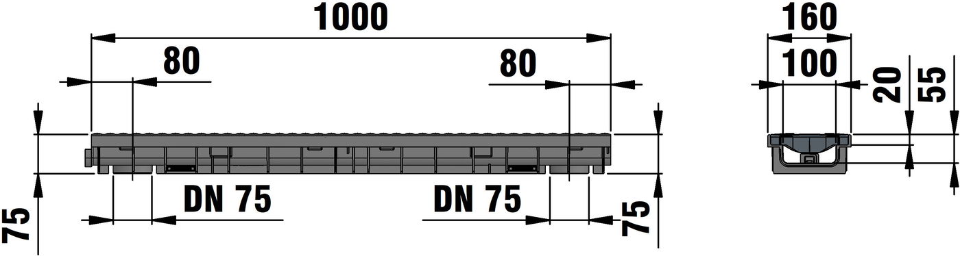 RECYFIX PRO 100 type 75 - Channel body made of recycled polypropylene, with integrated edge frames, with vertical connection possibility DN/OD 75, with FIBRETEC design slotted cover SW 110/9 mm, made of fibre-reinforced polyamide, in the colour Slate, with longitudinal slide protection and locking, load class A 15 - C 250 according to EN 1433, LxWxH 1000x160x75 mm, item no. 47468
