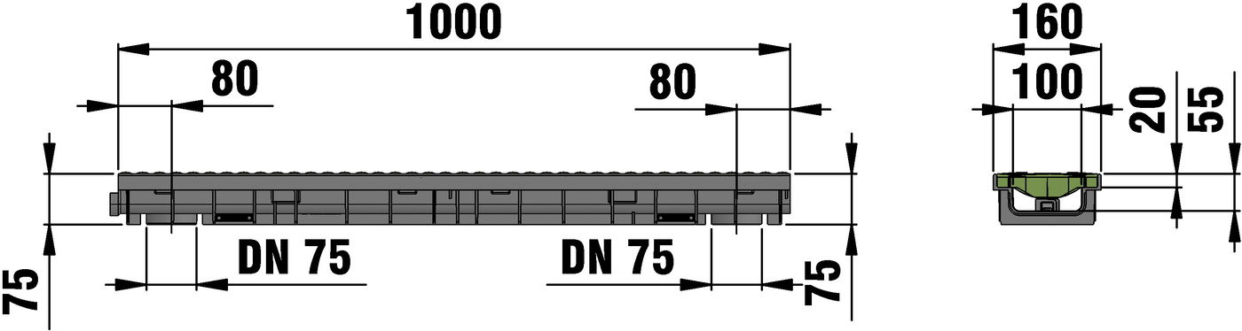 RECYFIX PRO 100 type 75 - Channel body made of recycled polypropylene, with integrated edge frames, with vertical connection possibility DN/OD 75, with FIBRETEC design slotted cover SW 110/9 mm, made of fibre-reinforced polyamide, in the colour Fern, with longitudinal slide protection and locking, load class A 15 - C 250 according to EN 1433, LxWxH 1000x160x75 mm, item no. 47415