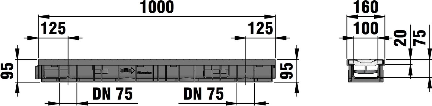 RECYFIX PRO 100 type 95 - Channel body made of recycled polypropylene, with integrated edge frames, with vertical connection possibility DN/OD 75, with reinforced slotted cover SW 80/10 mm, galvanised, with locking, load class A 15 - C 250 according to EN 1433, LxWxH 1000x160x95 mm, item no. 47015