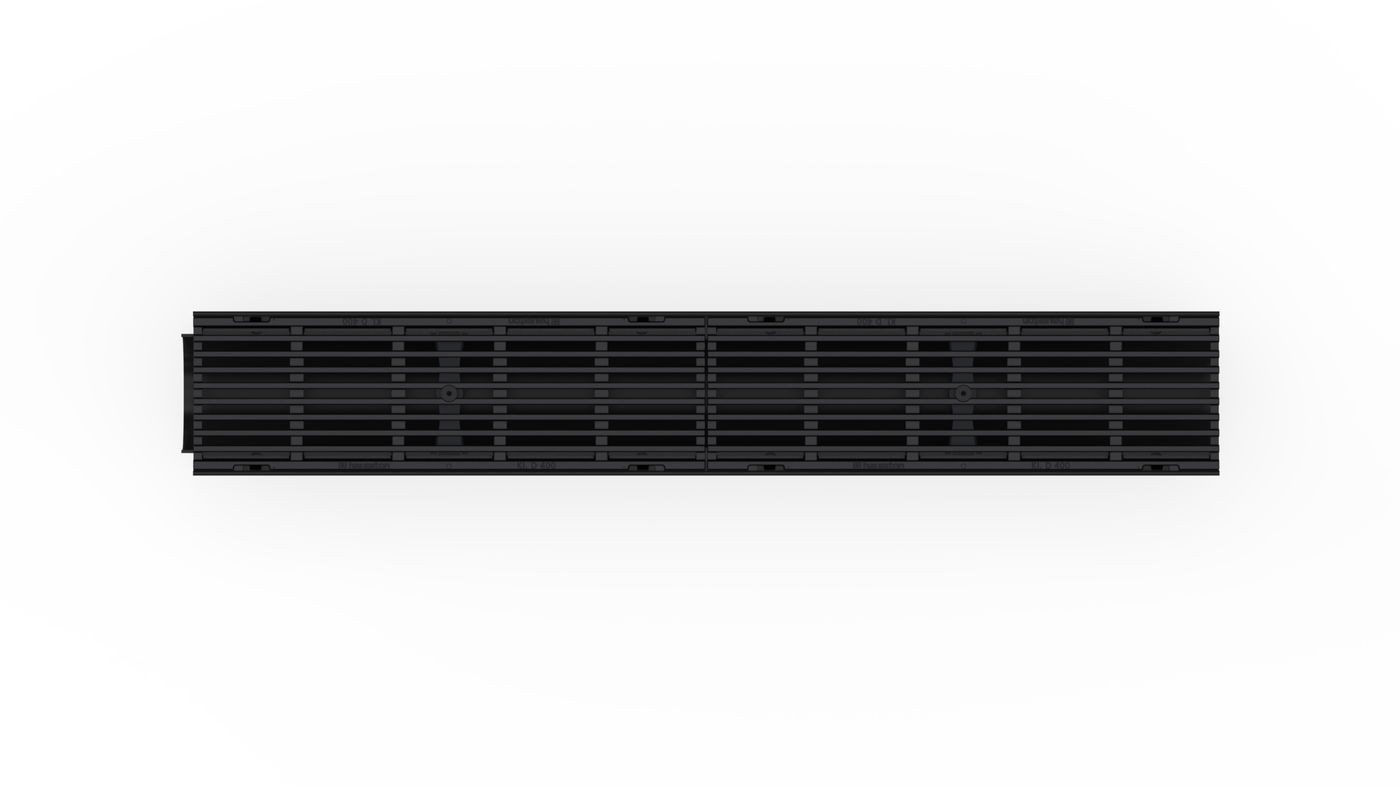 RECYFIX PRO 100 type 01 - Channel body made of recycled polypropylene, with integrated edge frames, with vertical connection possibility DN/OD 110, with longitudinal ductile iron cover bar distance 9 mm, made of spheroidal ductile iron EN-GJS-500-7, KTL-coated, with longitudinal slide protection and locking, load class A 15 - D 400 according to EN 1433, LxWxH 1000x160x150 mm, item no . 48630