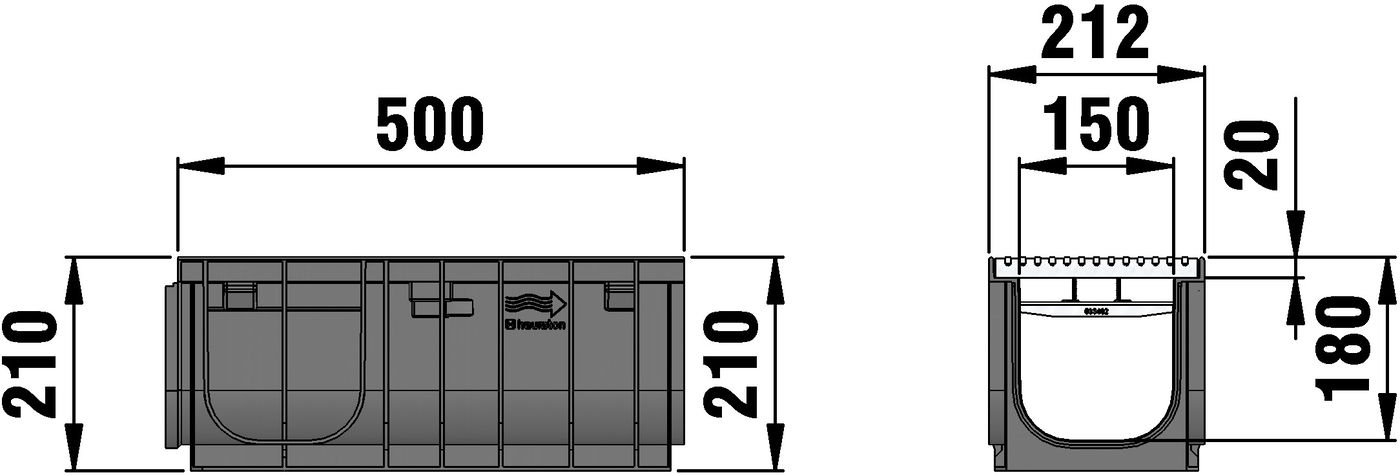 RECYFIX PRO 150 type 01 - Channel body made of recycled polypropylene, with integrated edge frames, with longitudinal cover Filigree bar distance 8 mm, stainless steel CNS 1.4301, with locking, load class A 15 according to EN 1433, LxWxH 500x212x210 mm, item no. 47181