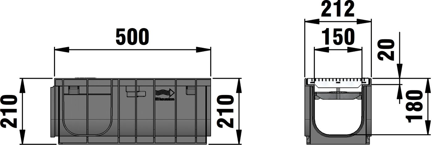 RECYFIX PRO 150 type 01 - Channel body made of recycled polypropylene, with integrated edge frames, with mesh cover MS 30/10 mm, stainless steel CNS 1.4301, with locking, load class A 15 - B 125 according to EN 1433, LxWxH 500x212x210 mm, item no. 47148
