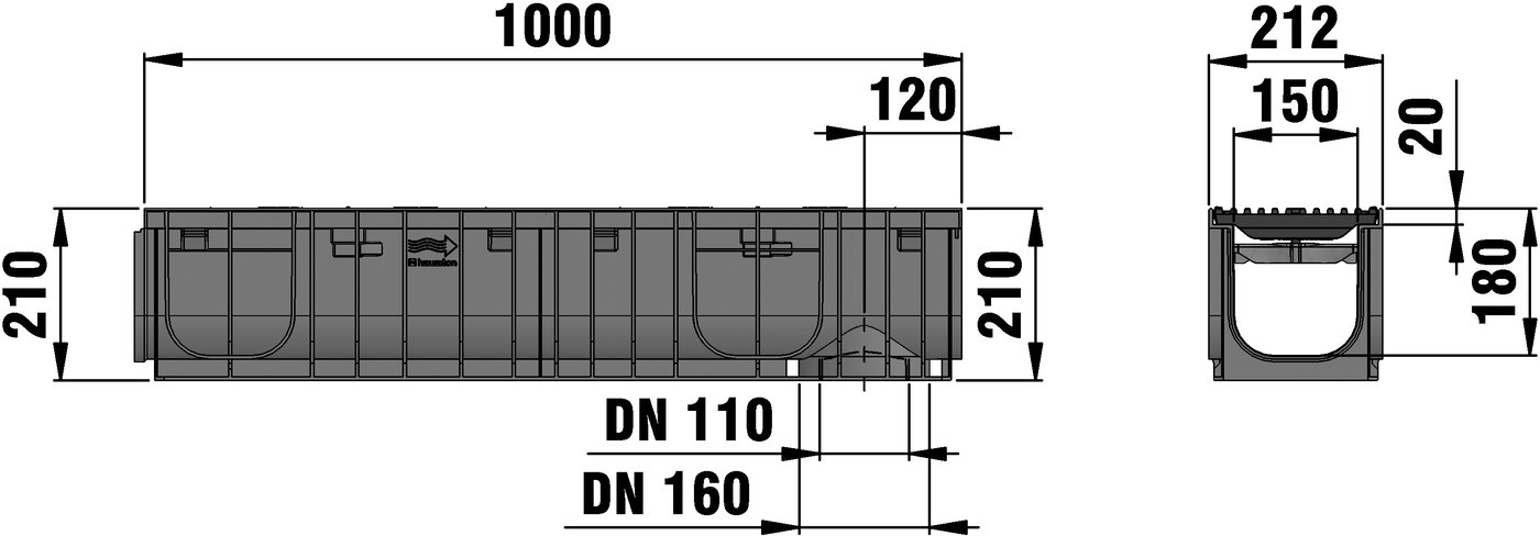 RECYFIX PRO 150 type 01 - Channel body made of recycled polypropylene, with integrated edge frames, with vertical connection possibility DN/OD 110/160, with longitudinal ductile iron cover bar distance 9 mm, made of spheroidal ductile iron EN-GJS-500-7, KTL-coated, with longitudinal slide protection and locking, load class A 15 - D 400 according to EN 1433, LxWxH 1000x212x210 mm, item no. 47160