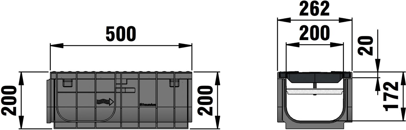 RECYFIX PRO 200 type 010 - Channel body made of recycled polypropylene, with integrated edge frames, with FIBRETEC design slotted cover SW 200/10 mm, made of fibre-reinforced polyamide, black, with longitudinal slide protection and locking, load class A 15 - C 250 according to EN 1433, LxWxH 500x262x200 mm, item no. 10165