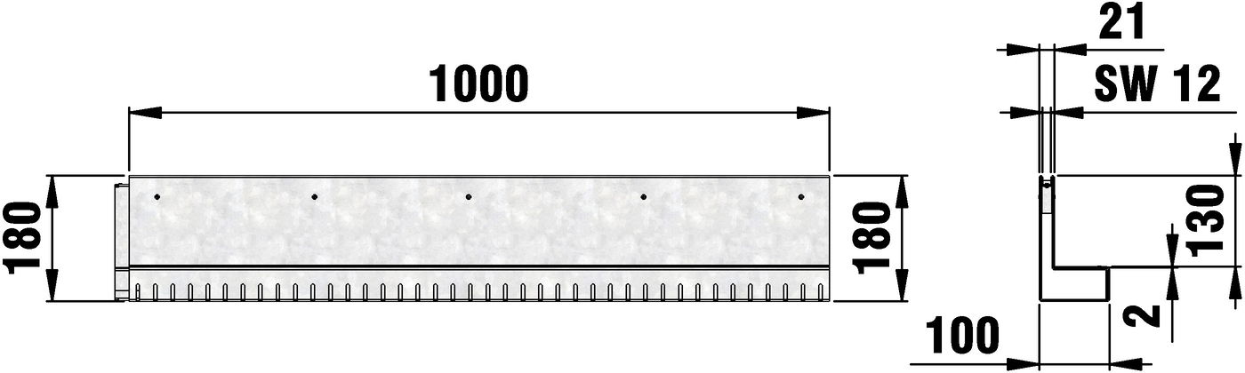 STEELFIX SLOT 100 type 180, slot width 12 mm, neck height 130 mm, asymmetric, perforated on one side, made of galvanised steel, with connector, load class A 15, LxWxH 1000x100x180 mm, item no. 10305