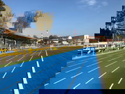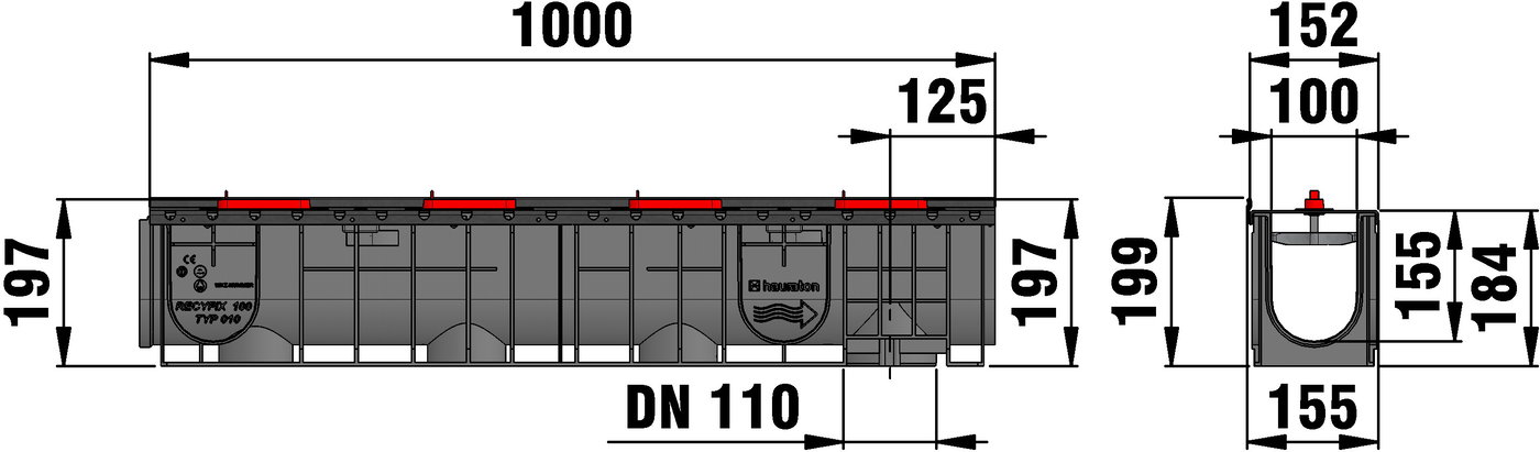 SPORTFIX Slotted channel 100 type 010 made of recycled polypropylene, black, with integrated slotted cover with one-sided turf edge as synthetic surface boundary, KTL-coated, with EPDM inserts, brick-red, for an easy installation of running track surfaces, LxWxH 1000x155x199 mm, item no. 10807