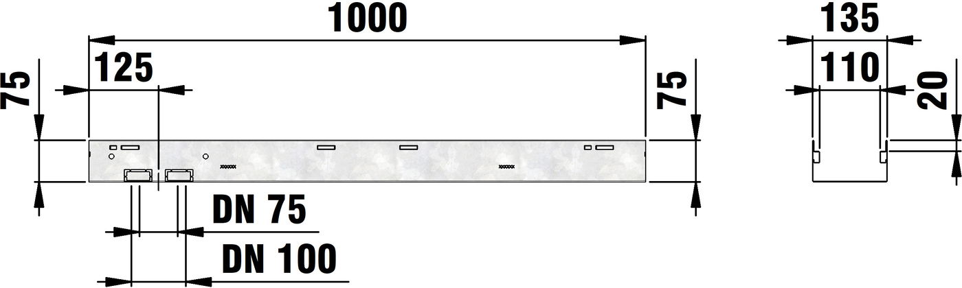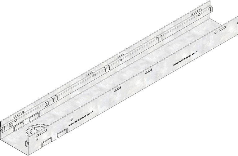 STEELFIX REGULAR 135 type 75 - Channel body, made of corrosion-protected galvanised steel, pedestrian and wheelchair-accessible, cover support tilted inwards, channel base and sides closed, but with perforation in the channel base as connection possibility for pipe outlet connection DN/OD 75 or DN/OD 100 and connection possibility with STEELFIX REGULAR sump unit, LxWxH 1000x135x75 mm, item no. 66007