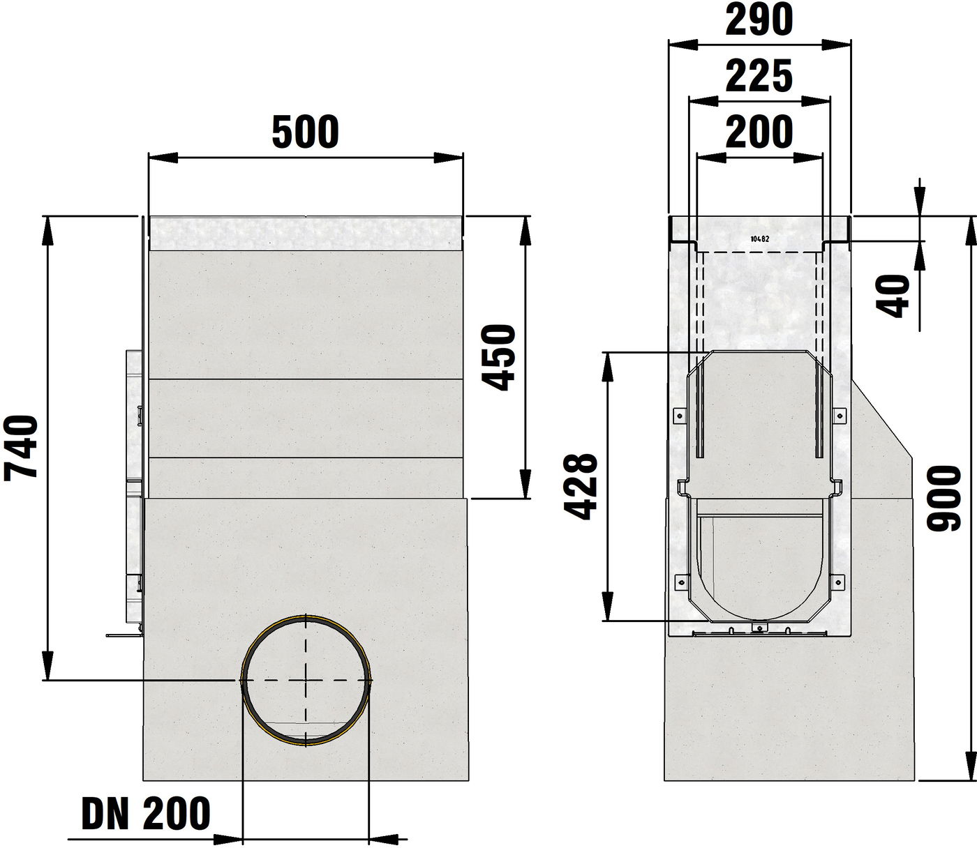 RECYFIX HICAP 5200 - Sump unit, 2-part, made of fibre-reinforced concrete, load class A 15 - F 900 according to EN 1433, CE compliant, with edge frame made of galvanised steel, with boltless quick-locking system SIDE-LOCK, 4-fold locking, one-sided connection possibility (on the side) with integrated PVC-U socket DN/OD 200, with connecting plate, galvanised, for connection of RECYFIX HICAP 5200, LxWxH 500x290x900 mm, item no. 10489