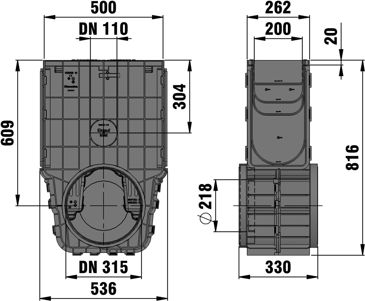 RECYFIX NC 200 - Sump unit made of recycled polypropylene, with integrated edge frame, on both sides preformed pipe connection element DN/OD 315, with removable silt bucket made of recycled polypropylene, with 2 end caps made of recycled polypropylene, suitable for both-sided connection of channel types RECYFIX NC 200, with ductile iron cover SW 204/18 mm, made of spheroidal ductile iron EN-GJS-500-7, black, with longitudinal slide protection, with 4-fold bolting, load class A 15 - E 600 according to EN 1433, LxWxH 500x262x816 mm, item no. 40075