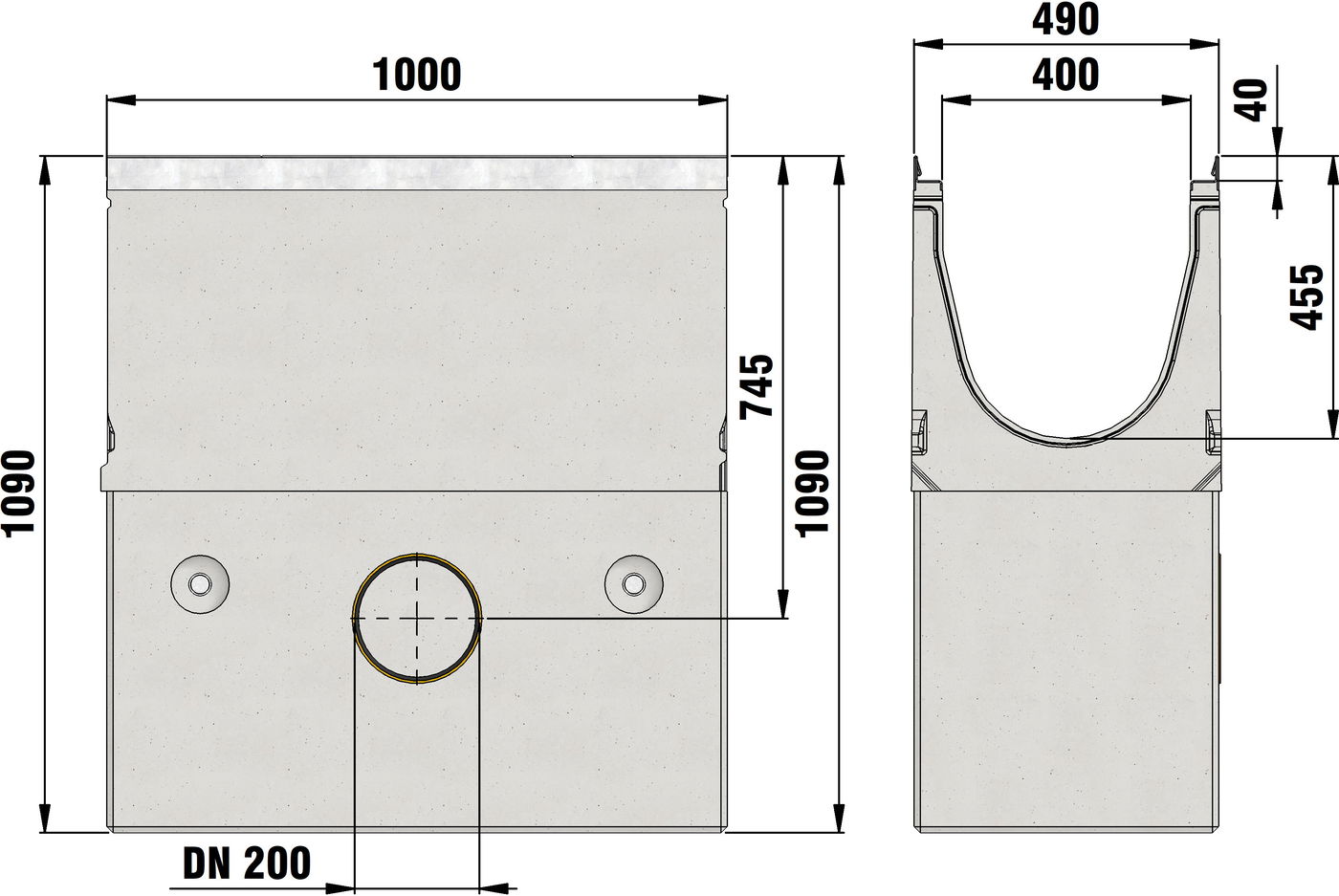 FASERFIX SUPER 400 type 01/type 01E - Sump unit, 2-part, made of fibre-reinforced concrete, load class A 15 - F 900 according to EN 1433, CE compliant, with edge frame made of galvanised steel and boltless quick-locking system SIDE-LOCK for quick and easy installation of the cover, 8-fold locking, one-sided connection possibility (on the side) with integrated PVC-U socket DN/OD 200, with removable silt bucket made of galvanised steel, suitable for both-sided connection of FASERFIX SUPER 400 type 01/type 01E, LxWxH 1000x490x1090 mm, item no. 24120