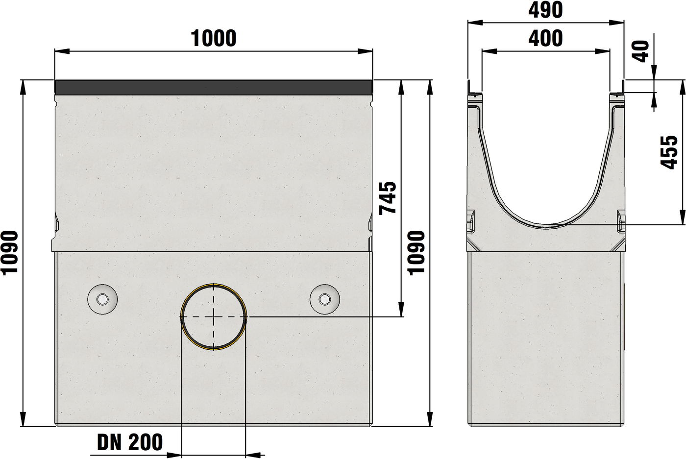 FASERFIX SUPER 400 type 01/type 01E - Sump unit, 2-part, made of fibre-reinforced concrete, load class A 15 - F 900 according to DIN 19580/EN 1433, CE compliant, with edge frame made of KTL-coated ductile iron, 8-fold locking, one-sided connection possibility (on the side) with integrated PVC-U socket DN/OD 200, with removable silt bucket made of galvanised steel, suitable for both-sided connection of FASERFIX SUPER 400 type 01/type 01E, LxWxH 1000x490x1090 mm, item no. 24420